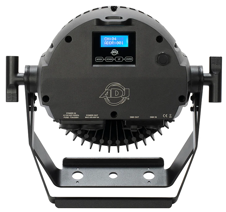 Les fonctionnalités professionnelles incluent six modes DMX, cinq modes de fonctionnement, six modes de gradation sélectionnables, quatre courbes de gradation sélectionnables et un menu DMX à quatre boutons avec un affichage numérique. L’unité est équipée de connecteurs d’alimentation verrouillables IP65 et de connecteurs DMX 3 broches classés IP65 avec des couvercles en caoutchouc.